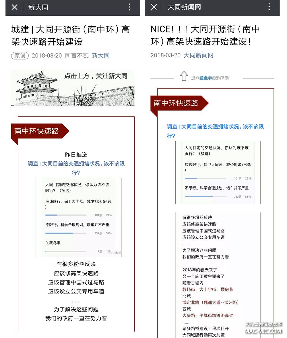 3月20日,《新大同》微信公眾平臺原創(chuàng)《城建 | 大同開源街(南中環(huán))高架快速路開始建設》一文被被大同知名官方媒體善意轉載(不加引號,筆者認為真善意也),雖說把圖片水印一張一張抹去裁剪了,雖說有些內容也被屏蔽了,但最起碼,來源還標注了“新大同”,所以我相信他們小編也是熱愛大同的,愛大同的人那必須都是我們的戰(zhàn)友。信息時代網絡資源共享無可厚非,何況這不是正說明我們做的棒棒噠?嫡出與私生子,流淌的不還都是咱的血脈?