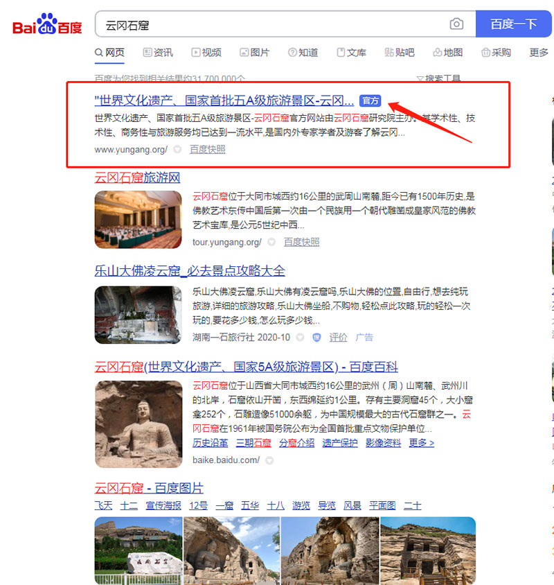 在百度搜索欄里只需要搜索“云岡石窟”四個字,即可顯示云岡石窟藍標(biāo)官網(wǎng)(如下圖)。
